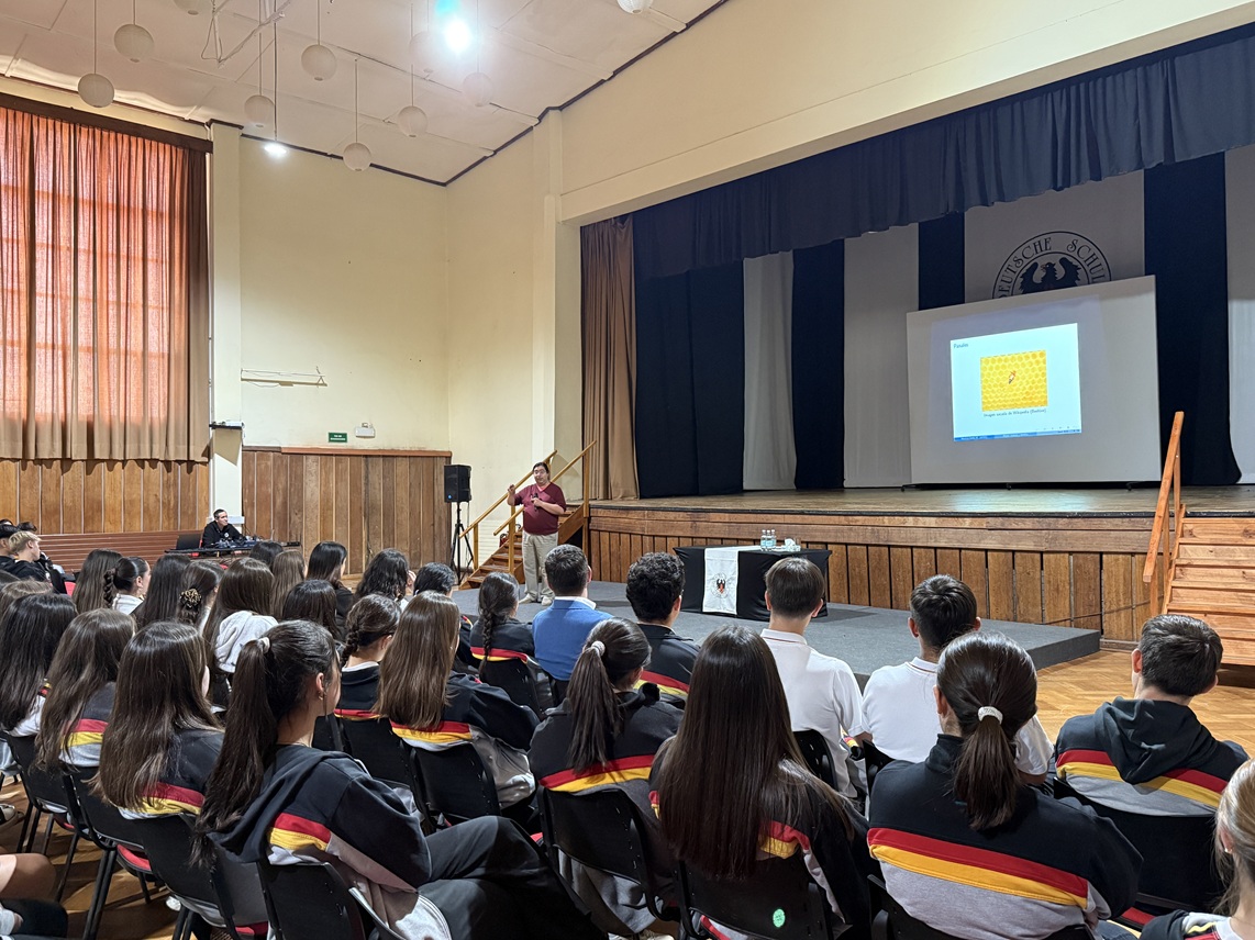 Charla “Abejas, naranjas y secretos”, dirigida a estudiantes de I a III medio, a cargo del Dr. Mauricio Godoy Molina, doctorado en la Universidad de Bergen, en Noruega, actualmente Profesor Asociado en la Universidad de La Frontera y Presidente de la Sociedad de Matemática de Chile. La charla abordó el empaquetamiento de círculos unitarios y esferas, lo que, en un caso óptimo, se visualiza como un panal de abeja.